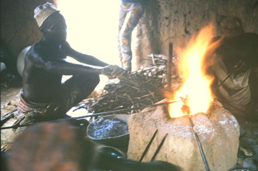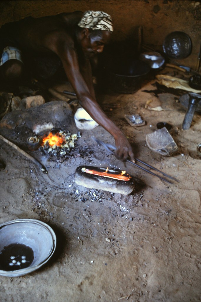 I spent two days in Bida, starting with a morning circumnavigation of the Old City Wall and its environs. Later, I visited several glass bead fabrication huts and one brass foundry hut. I was intrigued by the craftmanship and artistry of these skilled craftsmen. I spent hours, in a kind of joy and wonderment — just watching. Their hands were so quick and skillful, touching, stretching manipulating red-hot glass or delicately pounding out brass into its desired shape. I wondered how many centuries this work had be going on.
